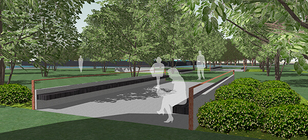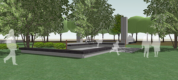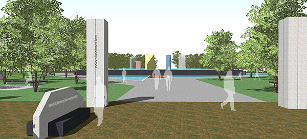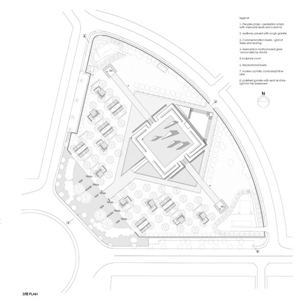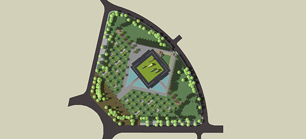 The design approach was laid out as a contemplative walk along the axis from the circle to the centre where the large sculpturesque obelisks were placed and walk continuing to the other end of the site. The idea being the site is not a destination but a part of the activity of people coming to the area. The first part of this walk begins from a pedestrian entry plaza located at the circle. Sculpturesque seaters aligned with granite cladded detailed obelisks were designed demarcating the boundary of the paved plaza and entry to the memorial garden. The intermediate commemorative walk in the memorial garden consists of walls etched with memories of the police martyrs along with spread out seating. The destination is the group of monumental sculptures juxtaposed in the centre of a water body etching a memory of the martyrs.